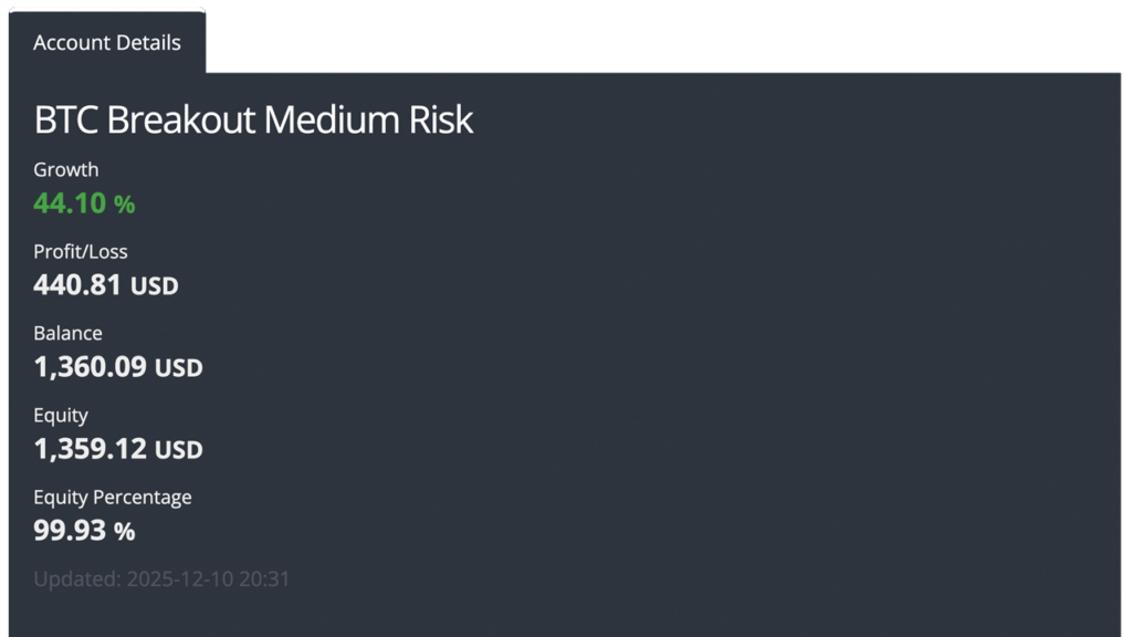 Our software executes each trade with fixed risk, automatic stop losses, and controlled position sizing to ensure disciplined compounding over time. Our trading team monitors software performance daily, fine-tuning parameters so the EA stays aligned with live market behaviour.